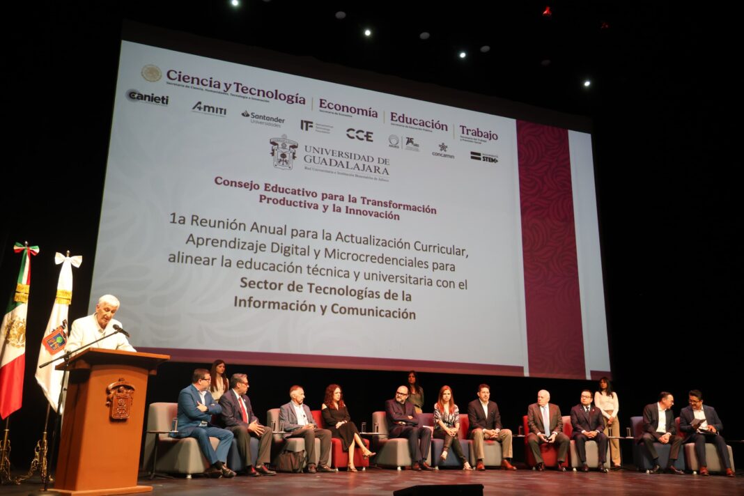 En el Conjunto de Artes Escénicas de la Universidad de Guadalajara, en el marco del Consejo Educativo para la Transformación Productiva y la Innovación, el Dr. González Placencia señaló que debemos no solo repensar nuestros planes de estudio sino las estrategias y acciones que nos permitan incorporar conocimientos emergentes para fortalecer a los egresados de forma integral, con la finalidad de que den respuesta tanto al contexto digital como a las necesidades de talento que requiere el mercado laboral.