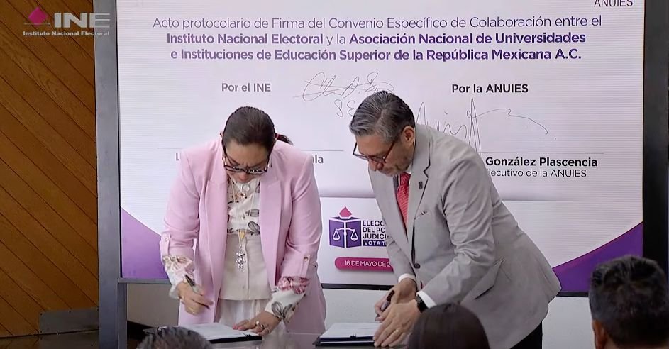 En representación de la Presidenta del INE, Guadalupe Taddei Zavala, la Mtra.Claudia Arlet Espino, Secretaria Ejecutiva del Instituto, señaló que la firma de este convenio se da en el marco del proceso electoral inédito que vivimos para elegir a los integrantes del Poder Judicial de la Federación de México. Dijo que, una vez más, el INE une esfuerzos con las 244 instituciones de educación superior del país que conforman la ANUIES, para fortalecer los procesos democráticos de nuestro país.